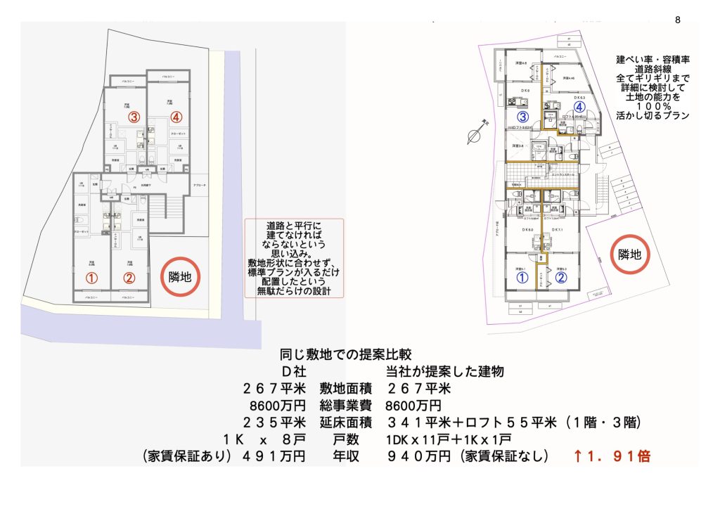 (左)大手アパマンデベロッパの提案は2階建